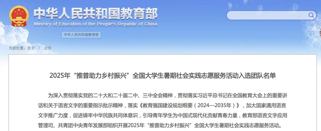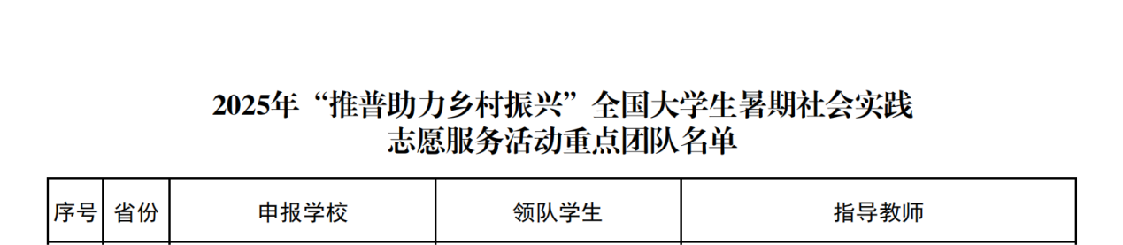 2025年7月4日,教育部公布了2025 年“推普助力乡村振兴”全国大学生暑期社会实践志愿服务活动入选团队名单。今年会jinnianhui官网1支团队入选重点团队,3名教师作为重点团队指导教师。