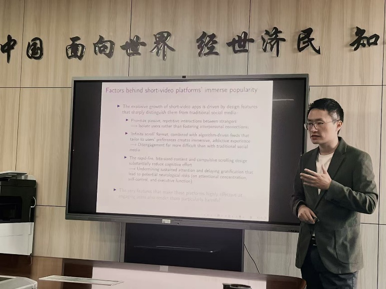讲座围绕刘畅副教授的合作论文“Flick, Click and Sick: Mental Health Risk and Short Video Platforms”展开。从短视频平台的全球发展脉络切入,不到十年间,短视频平台实现全球性成功,用户使用时长显著超越传统社交媒体,而同期全球心理健康水平呈下降趋势。短视频平台无需添加好友即可建立连接、算法驱动的无限滚动内容流精准匹配用户偏好等鲜明设计特点,既可能降低用户认知能力,又易形成成瘾性使用体验。在此背景下,该研究以中国这一全球最大且最成熟的市场为例,聚焦“短视频应用是否对心理健康存在负向因果效应”这一核心问题,首次提供了短视频平台影响心理健康的大规模因果证据。