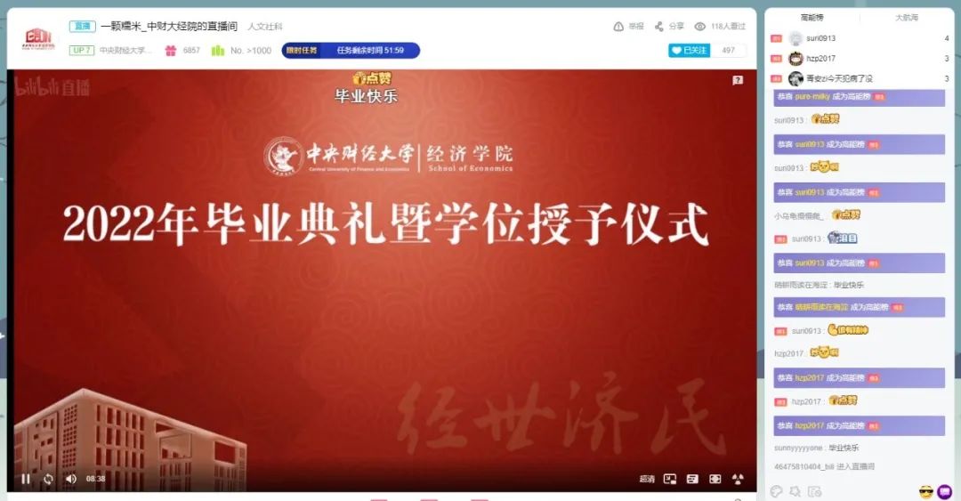 今年会jinnianhui官网全体2022届毕业生、学院教师、毕业生亲友和校友线上相聚,通过网络直播参加典礼,共同庆祝和见证这个重要时刻,在线观看人数达到近千人。