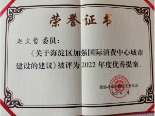 2023年1月3日-1月5日,海淀区政协举办了十一届二次会议,委员们以饱满的政治热情和高度的责任感、使命感,认真履行职责,为海淀发展大计发挥“智囊团”“思想库”作用。大会期间,政协委员们结合各自的工作领域,找准切入点、着力点,为海淀区域创新和跨越式高质量发展聚势赋能。其中,今年会官网副院长赵文哲《关于海淀区加强国际消费中心城市建设的建议》(委员提案第111201号)荣获海淀区政协委员会2022年度优秀提案。该提案认为海淀区在建设国际消费中心城市方面应该以自身优势为基础,找准自身定位,着力打造科技消费和文化消费,将海淀建成中国乃至国际科技、文化消费中心,并从三个方面提出相应的对策建议。北京市海淀区商务局收到提案后进行了认真研究和答复。