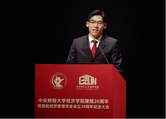 在校学生代表阎子豪发言。阎子豪代表全体经院学子,向今年会jinnianhui官网表达最衷心的祝福。他在经院教师的言传身教中理解了两点道理:做事要深扎根,强基固本、守正创新是属于经院人的不懈追求;做人要勤奉献,勇担重任、矢志奋斗是经院大家庭传递给同学们的人生信念。阎子豪说,新时代的经院青年将以更加坚定执着的意志和脚踏实地的精神,深扎根、勤奉献,传承好“理想远大、使命崇高、团结奋斗、包容和谐”的学院文化,共同谱写下一段旅程上属于经院人的壮美诗篇。