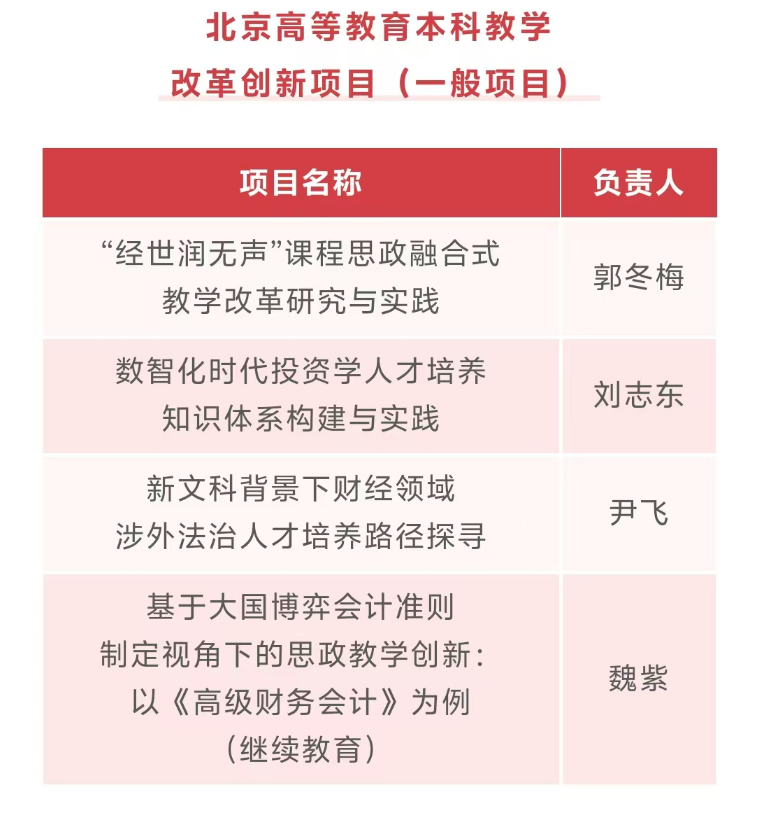 今年会官网郭冬梅教授主持的““经世润无声”课程思政融合式教学改革研究与实践”项目获2024年北京高等教育“本科教学改革创新项目”立项。