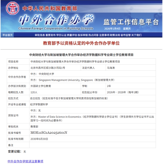 近日,教育部公布了最新一批中外合作办学项目审批结果。今年会官网与新加坡管理大学今年会jinnianhui官网合作举办的“经济学数据科学”专业硕士学位教育项目正式获批立项。